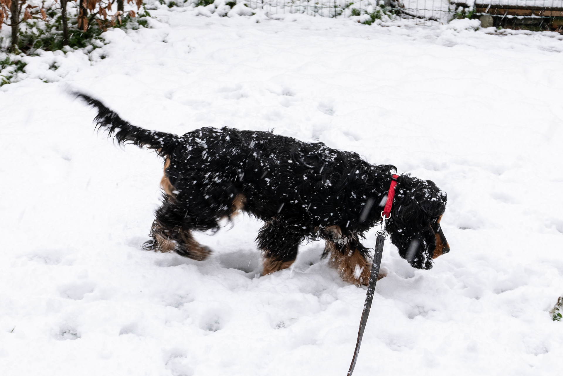 7-4-2021 - Een onverwacht (althans voor de fotograaf) dik pak sneeuw vanmorgen. 's Middags is het al weer verdwenen, maar toen regende het. Voor Brodie lijkt het niets uit te maken; zijn staartje kwispelt altijd.