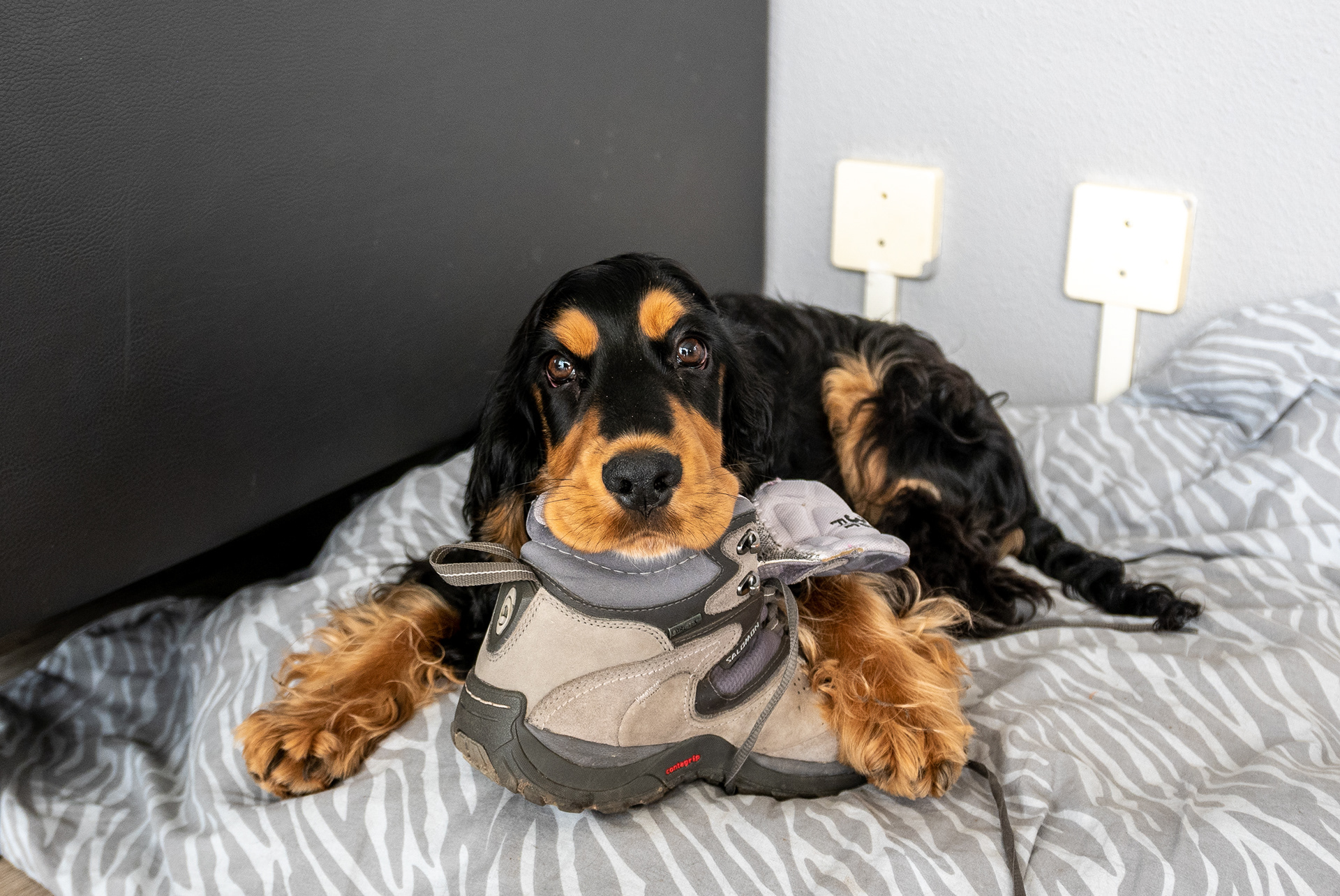 23-3-2021 - Brodie ontfermt zich over een wandelschoen om duidelijk te maken welke activiteit zijn voorkeur heeft. Communiceren met een hond is simpeler dan je denkt, de fotograaf denkt dat de hond dat ook denkt over de communicatie met baasje en vrouwtje.