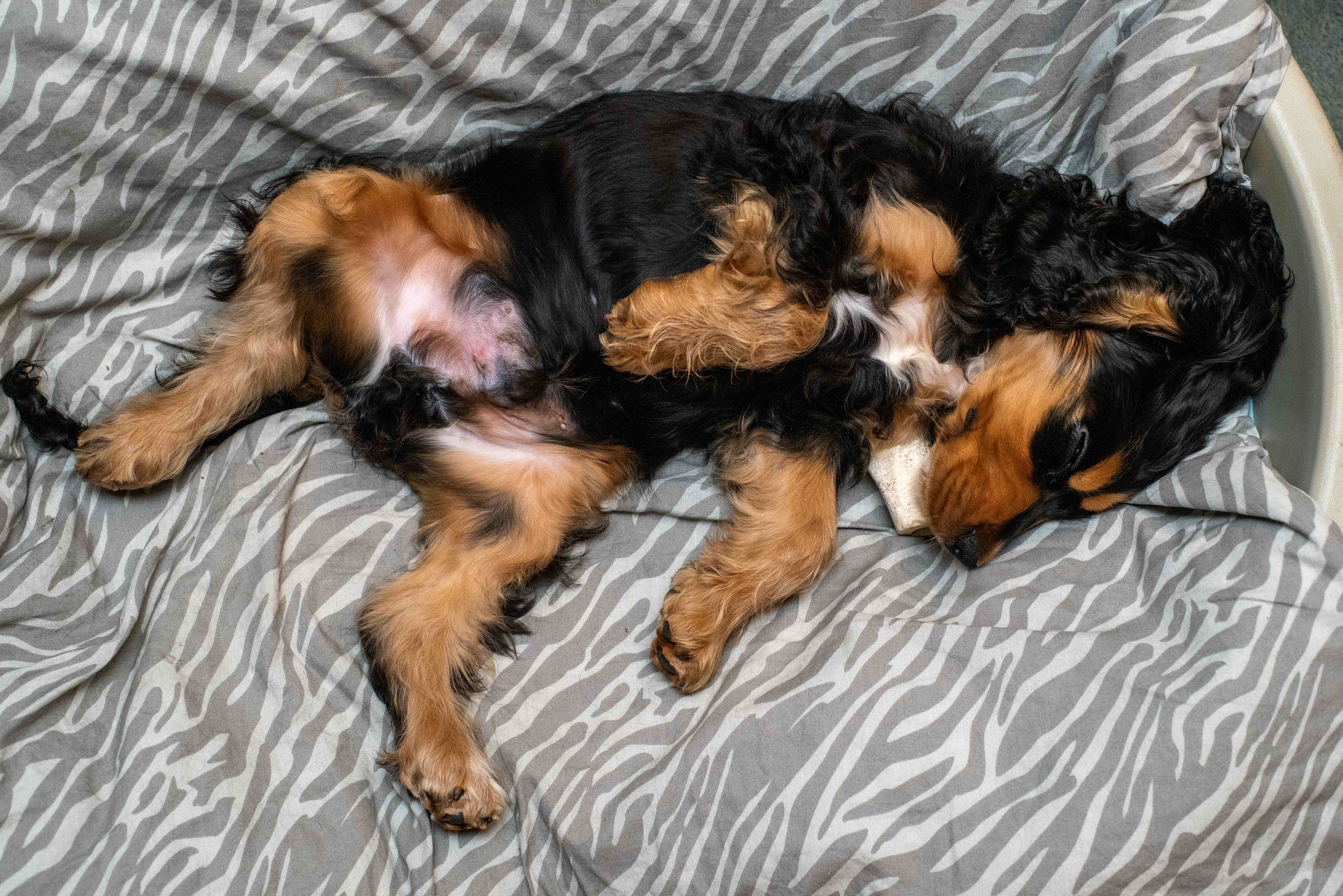 25-1-2021 - Het ene moment ligt Brodie fanatiek op een bot te kauwen, het volgende moment is hij in diepe slaap verzonken. Jaloersmakend, uitgezonderd dat bot dan.