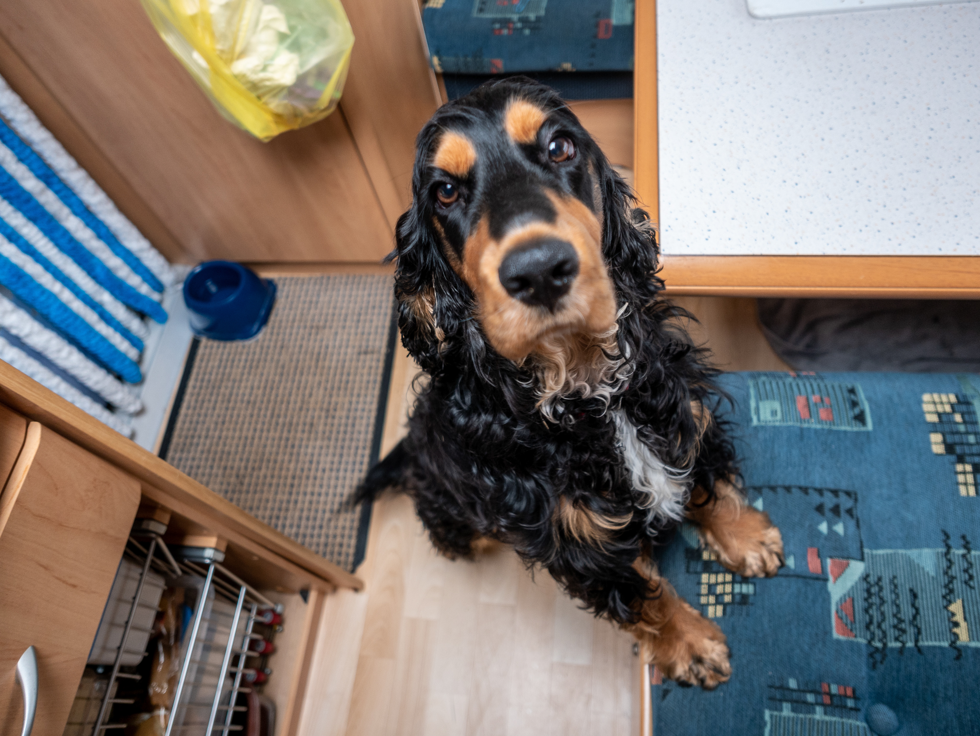 10-8-2021 Brodie speurt met 'losse handen' op het aanrechtblad naar de beloningskoekjes die voor hem klaarliggen.