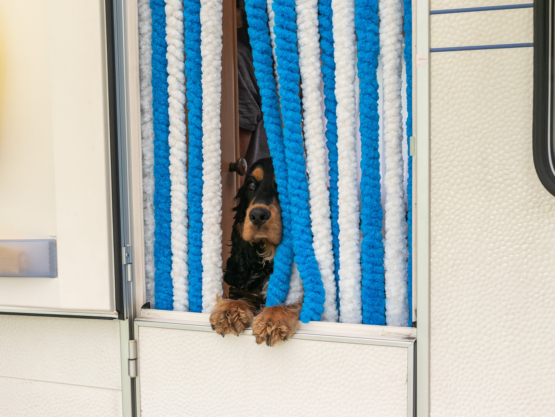 19-6-2021 - Brodie kampeert; dat halve deurtje in de caravan kan zijn goedkeuring wel wegdragen.