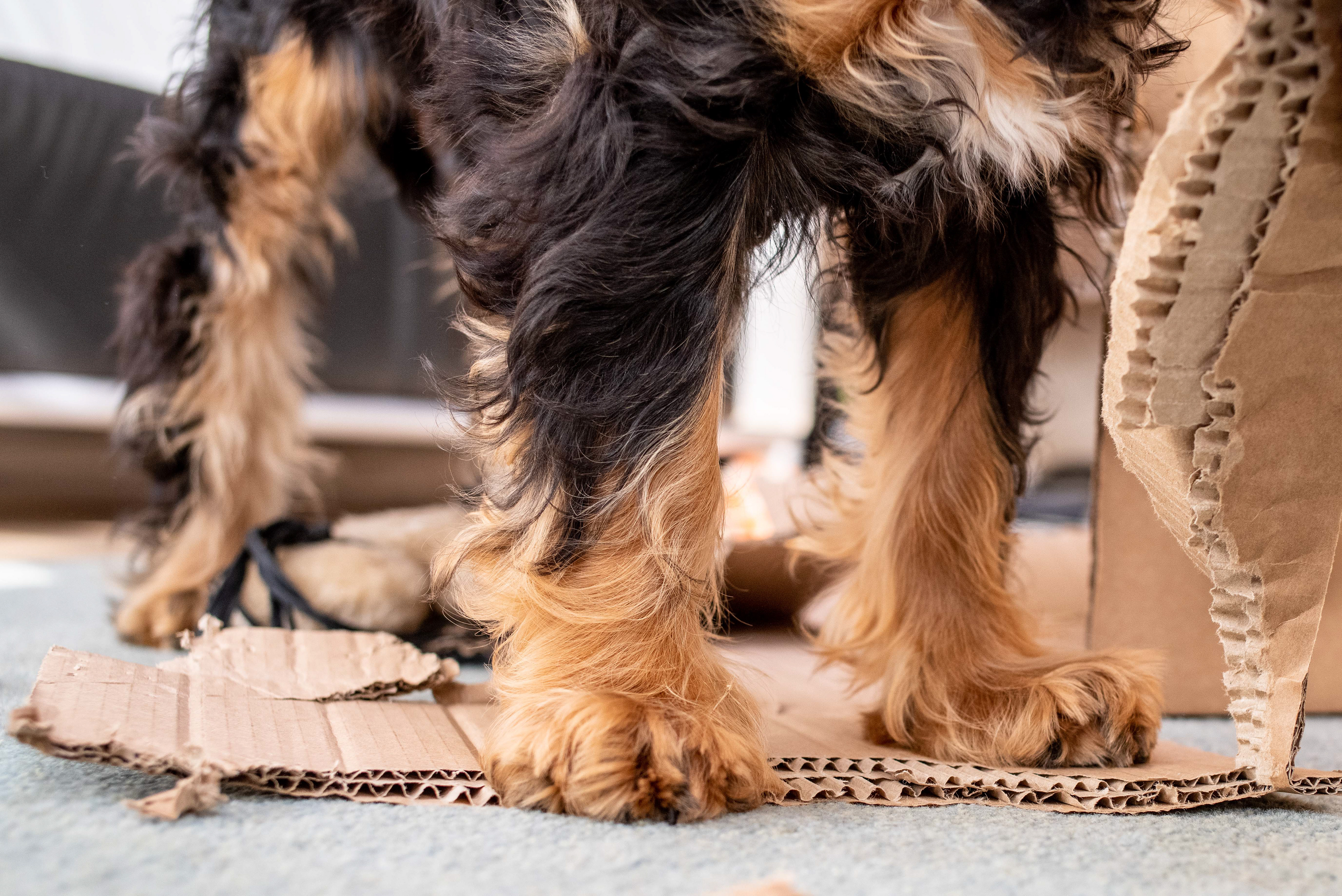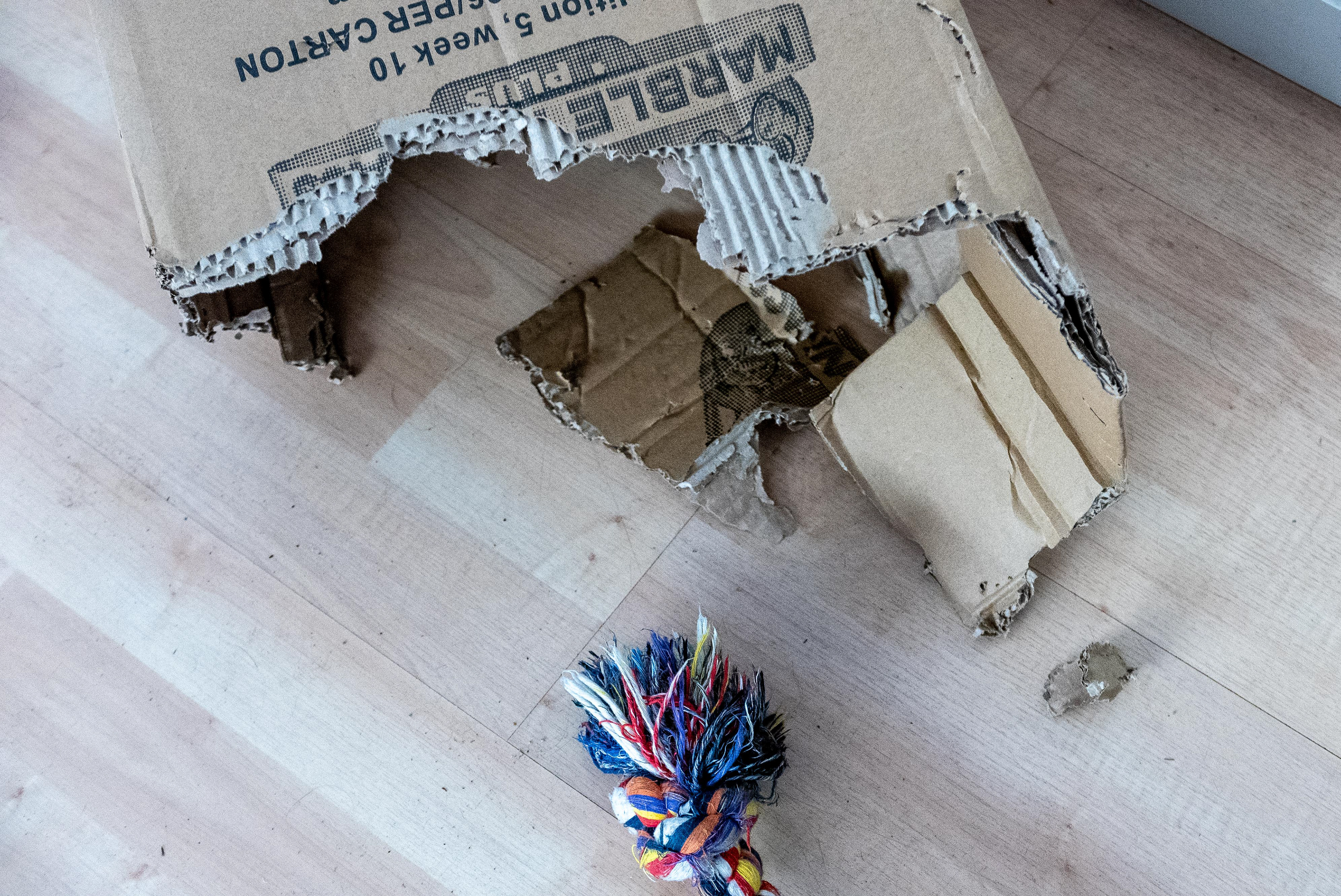 3-3-2021 - Het is de bedoeling van de fotograaf om een foto te maken, waarop te zien is hoe groot Brodie is. Maar meetlat en Brodie in een shot bleek 'n brug te ver: hij gaat liever aan een kartonnen doos knauwen. Dat leidt tot bovenstaande foto van zijn stevige poten, drie van de vier althans.