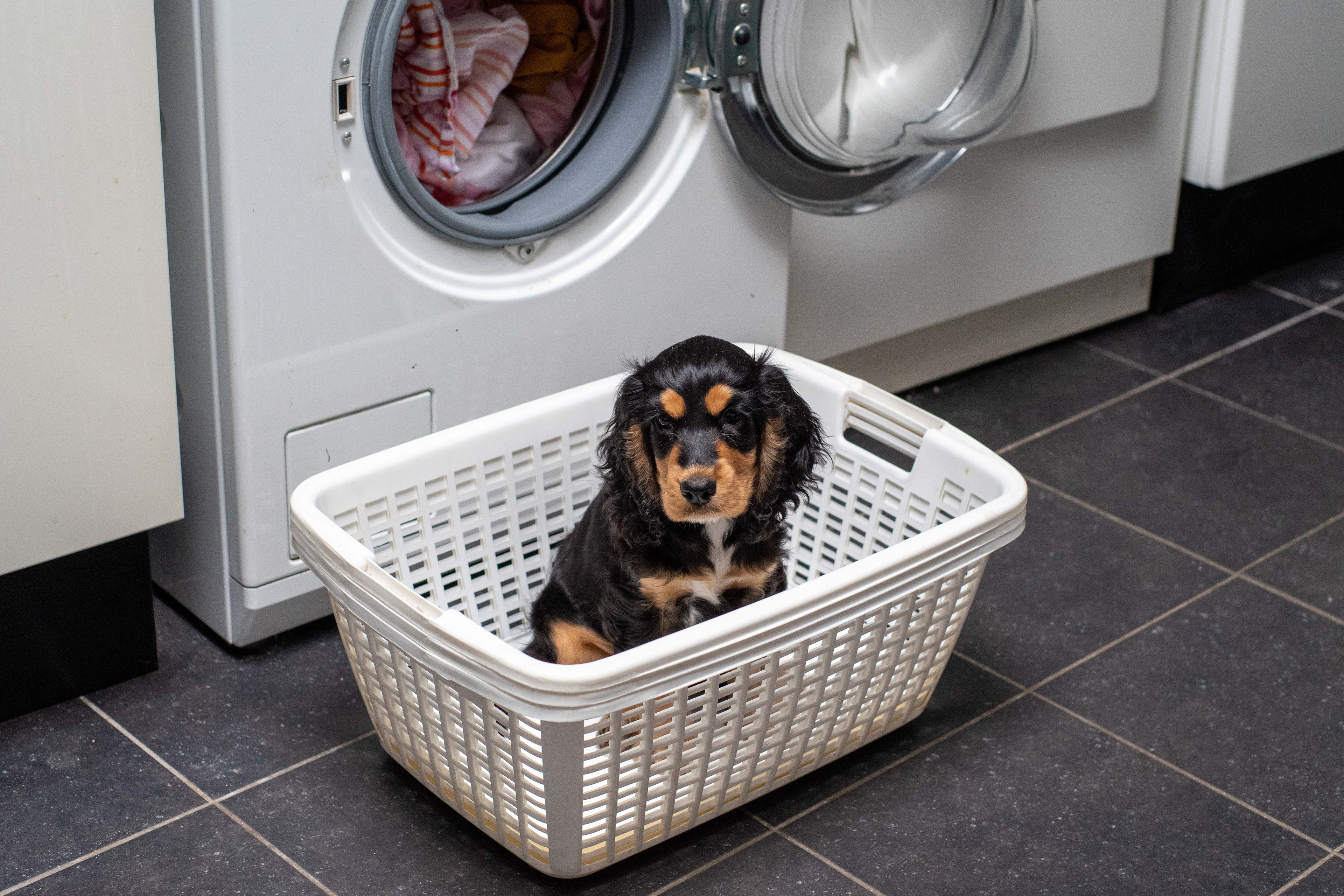 12-2-2021 - Hoeveel Brodie is gegroeid, realiseert de fotograaf zich pas als hij hem in zijn puppymandje ziet liggen. Kop en kont passen er niet meer bij. Toch gaat hij er nog geregeld in liggen, zeker als het mandje door de zon gekust wordt. Misschien oefent Brodie zo het hondentalent om relaxt te liggen in een op het oog ongemakkelijke houding. Hij heeft zeker aanleg.