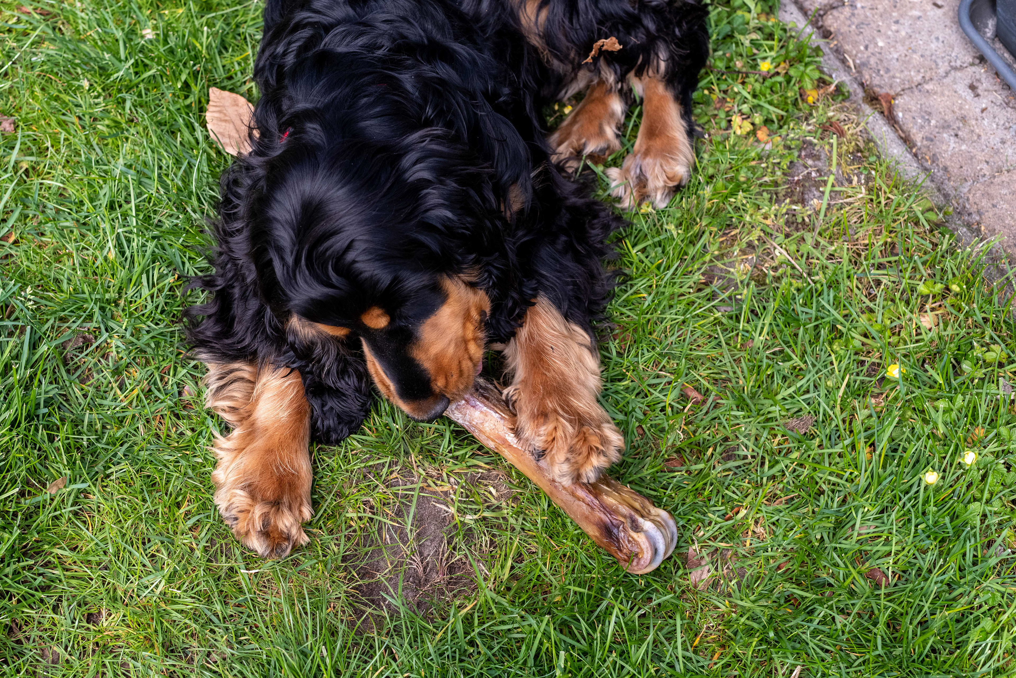 25-4-2021 - Brodie picknickt in de tuin met een zojuist gekregen kalfsbot.