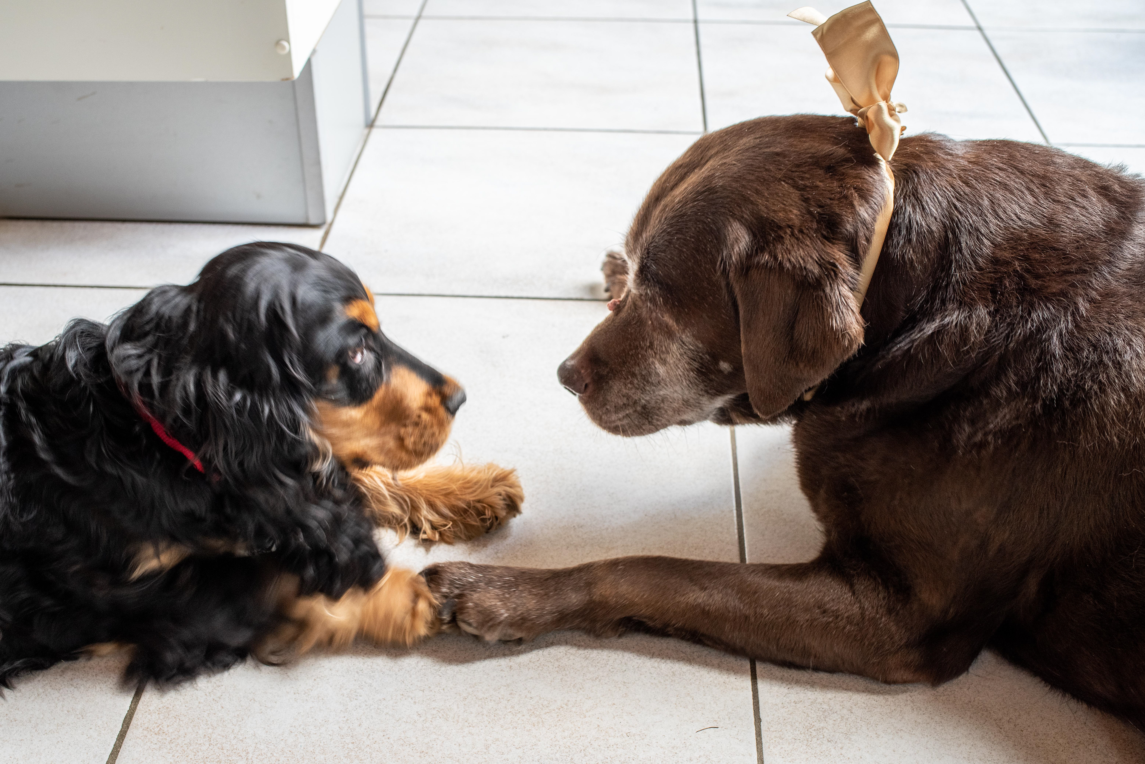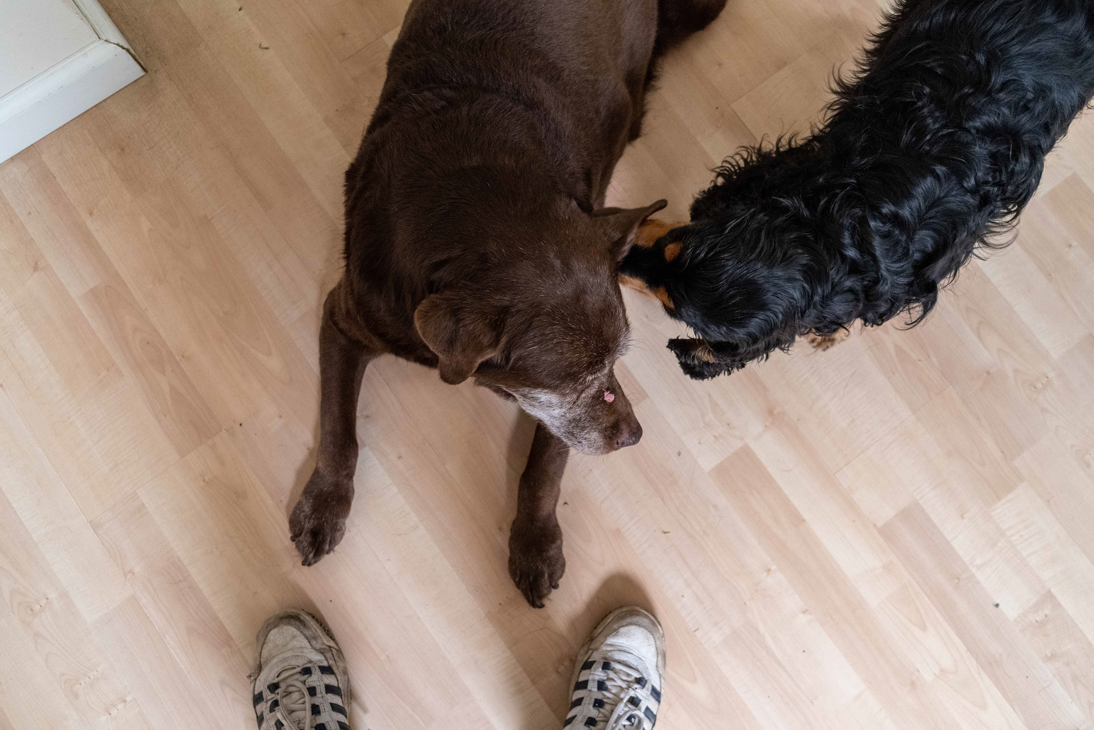 10-5-2021 - Labrador Dribbel komt logeren. Brodie wast hem de oren. De fotograaf, die er met zijn neus bovenop staat, weet niet of het een gebaar van dominantie of van onderdanigheid is. Maar omdat ze er allebei plezier in hebben, gaat hij er zich de kop niet over breken.