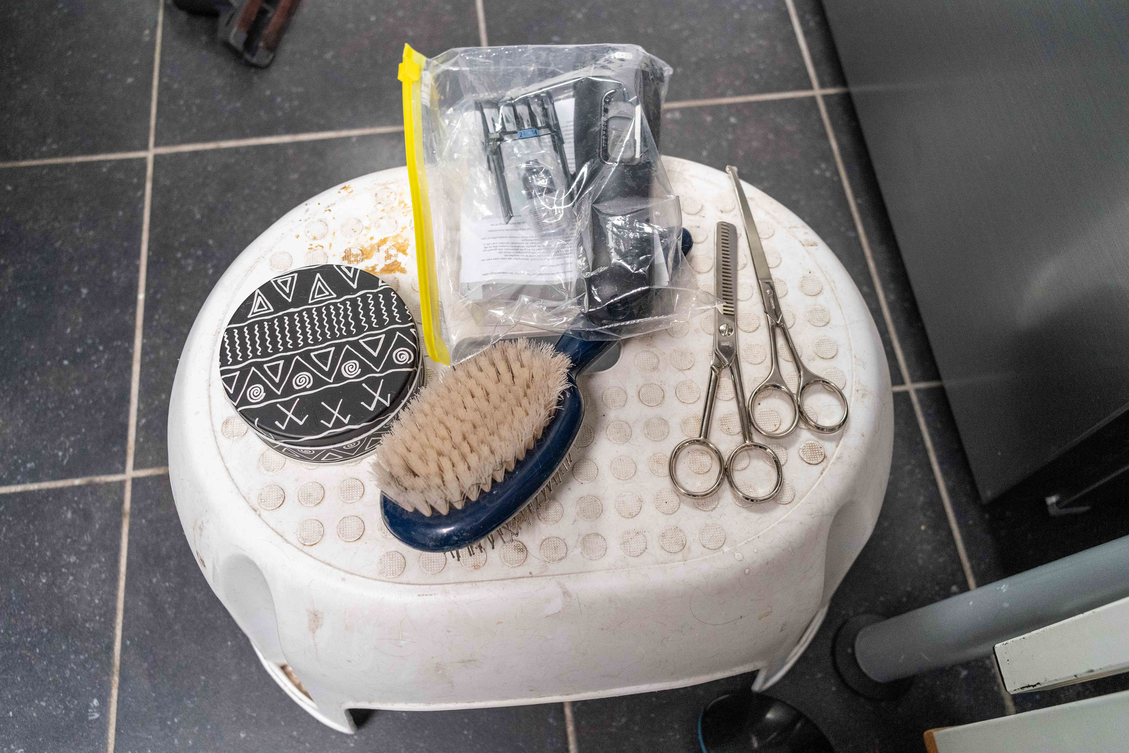30-4-2021 - Trimmen wordt een vast onderdeel van brodies verzorging. Om hem niet te veel af te leiden tijdens het borstelen etc. is de fotograaf er niet (nog niet) bij aanwezig. Vandaar het stilleven van Brodies kaptafel.