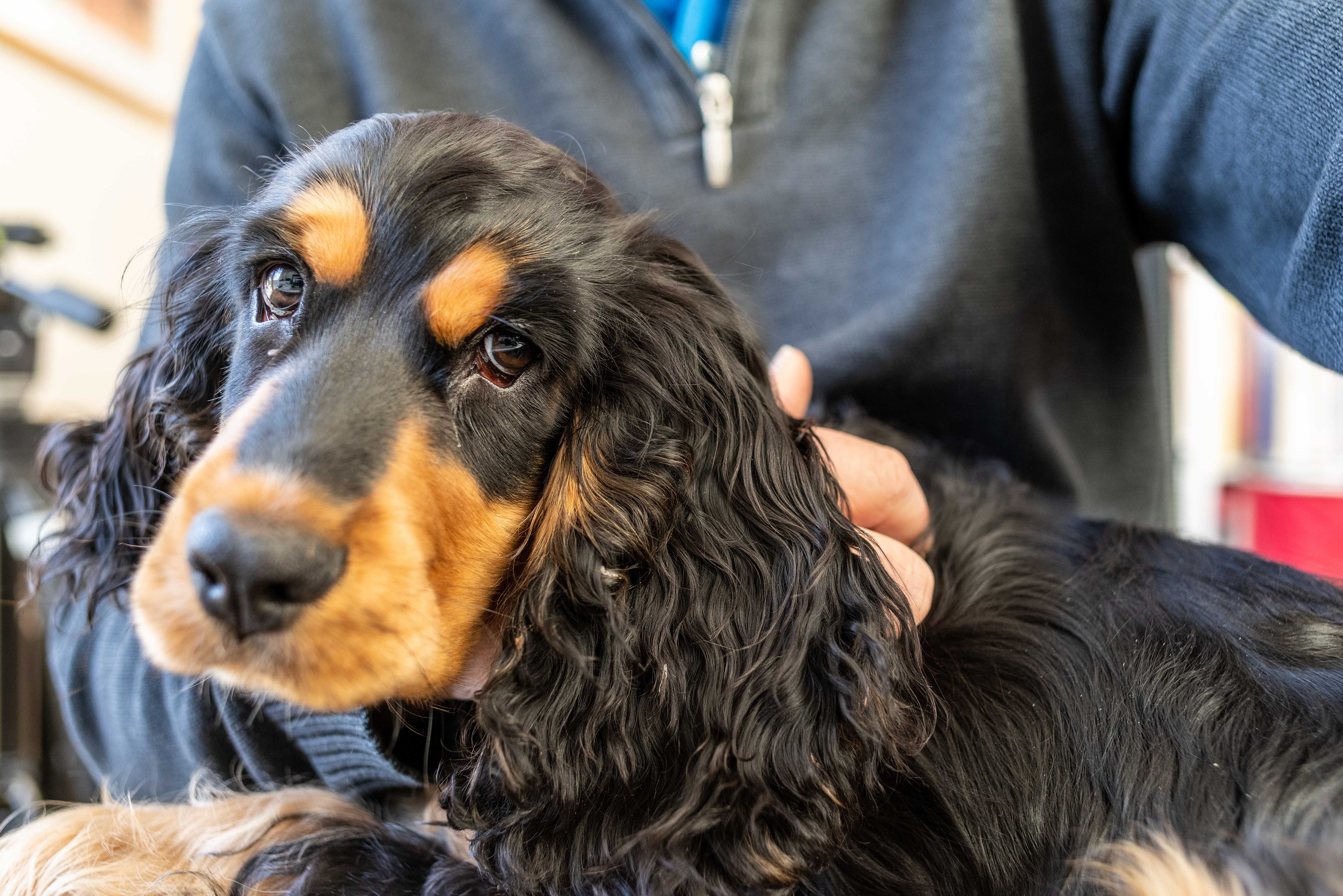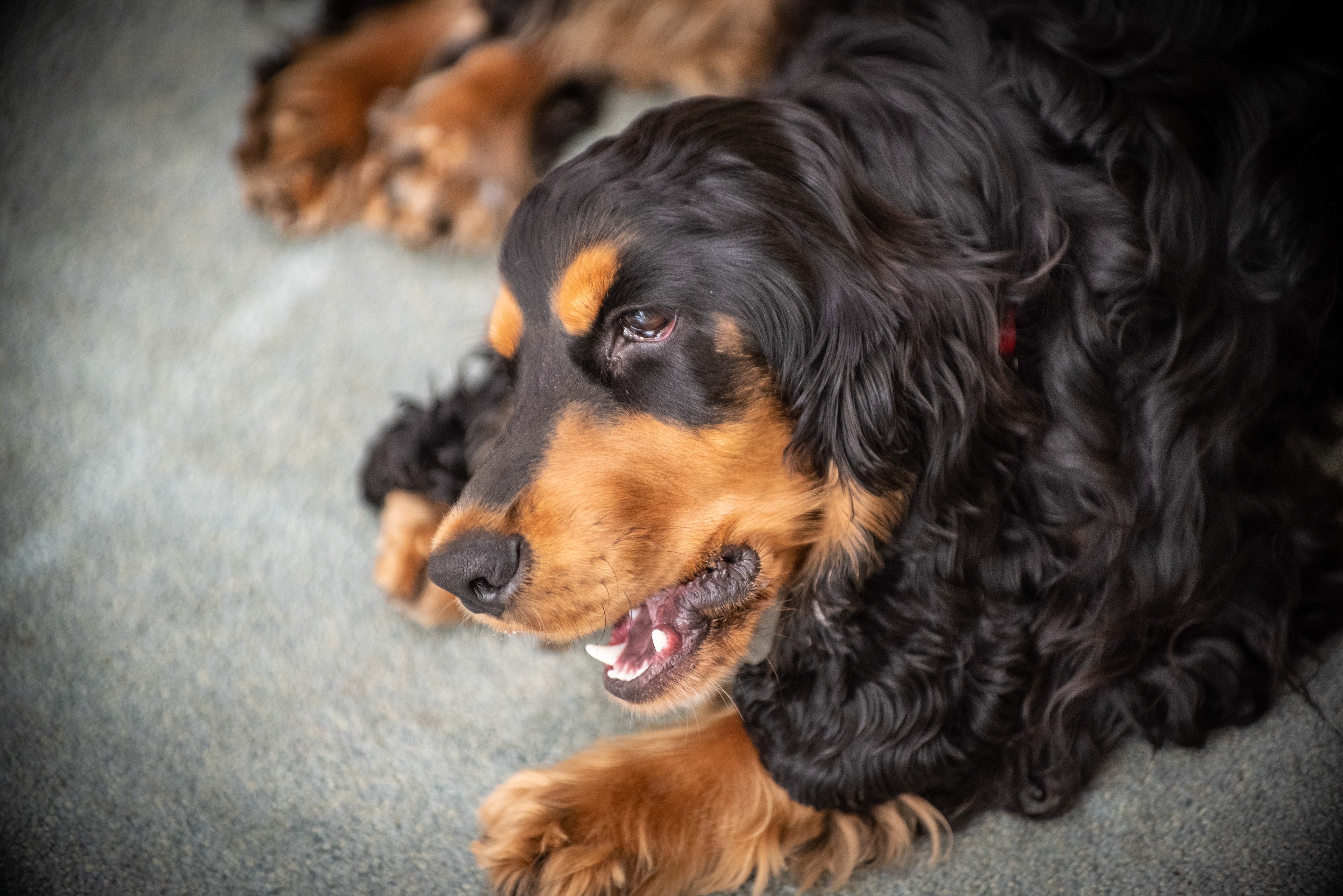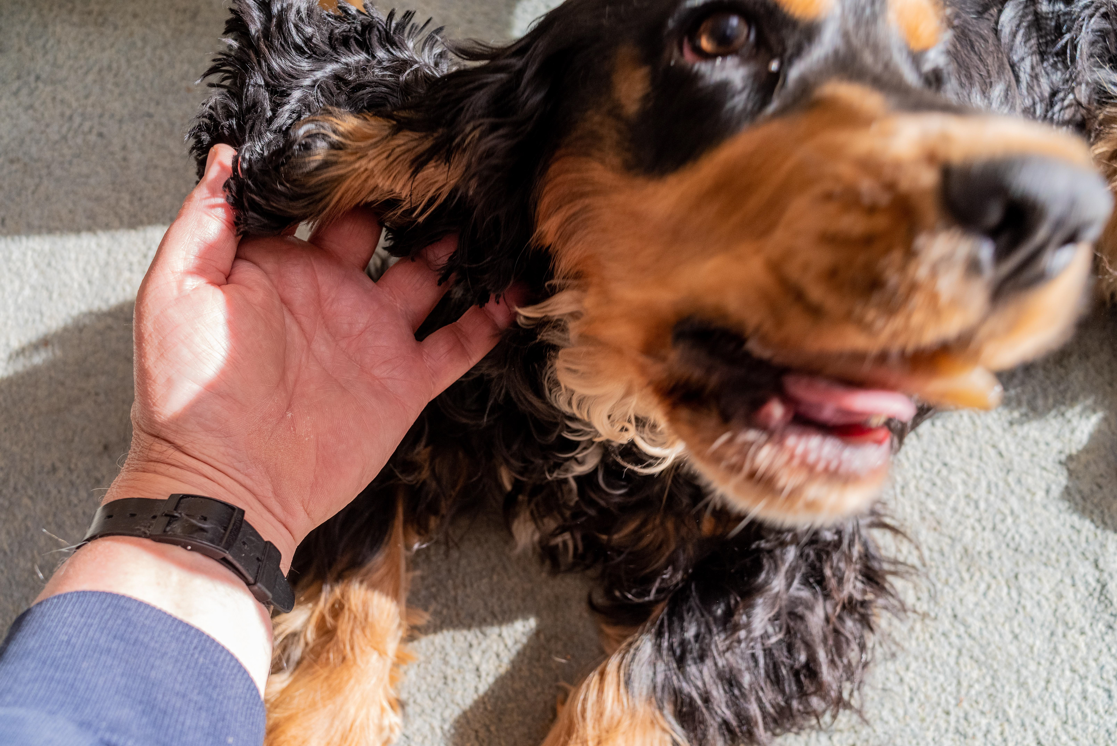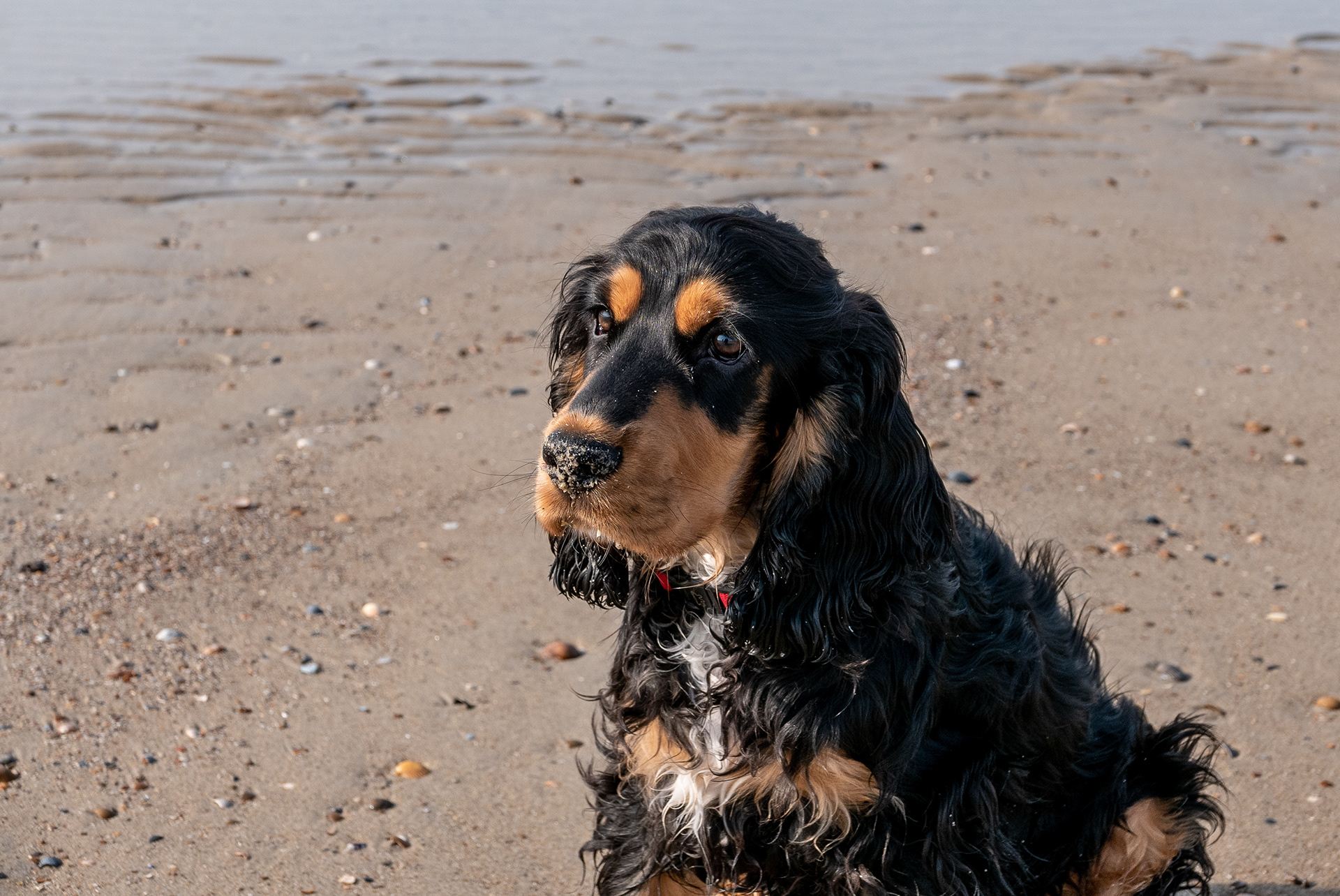 24-3-2021 - Zand op neus en overal, natte poten, oren en buik; portret van een voldane Cocker Spaniel.