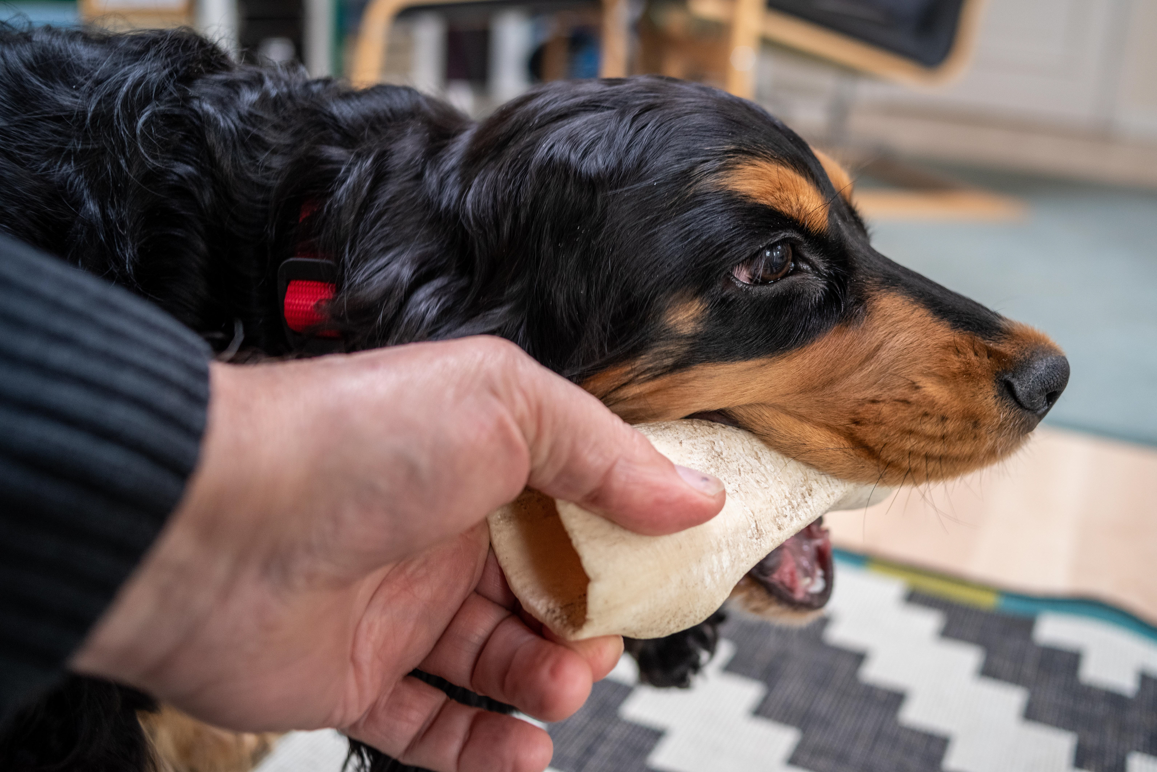 16-2-2021 - Het is een simpel spelletje; De Fotograaf houdt een bot vast, Brodie kauwt naar hartelust. Soms verandert Brodie het karakter van het spel in een trekspelletje; even kijken wie de sterkste is. De vingers van de fotograaf komen dan wel in de gevarenzone.