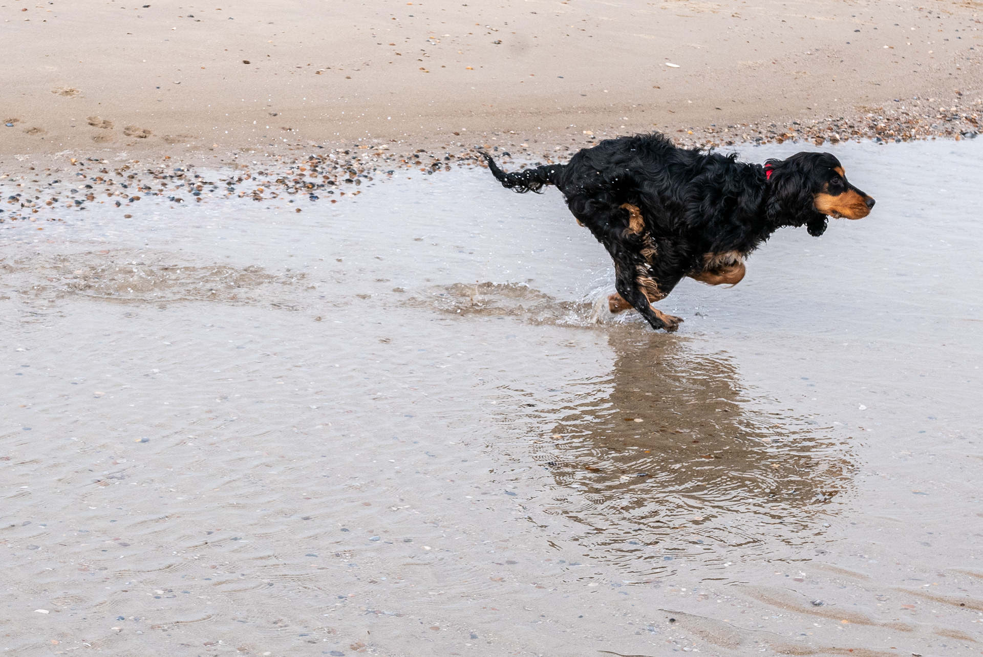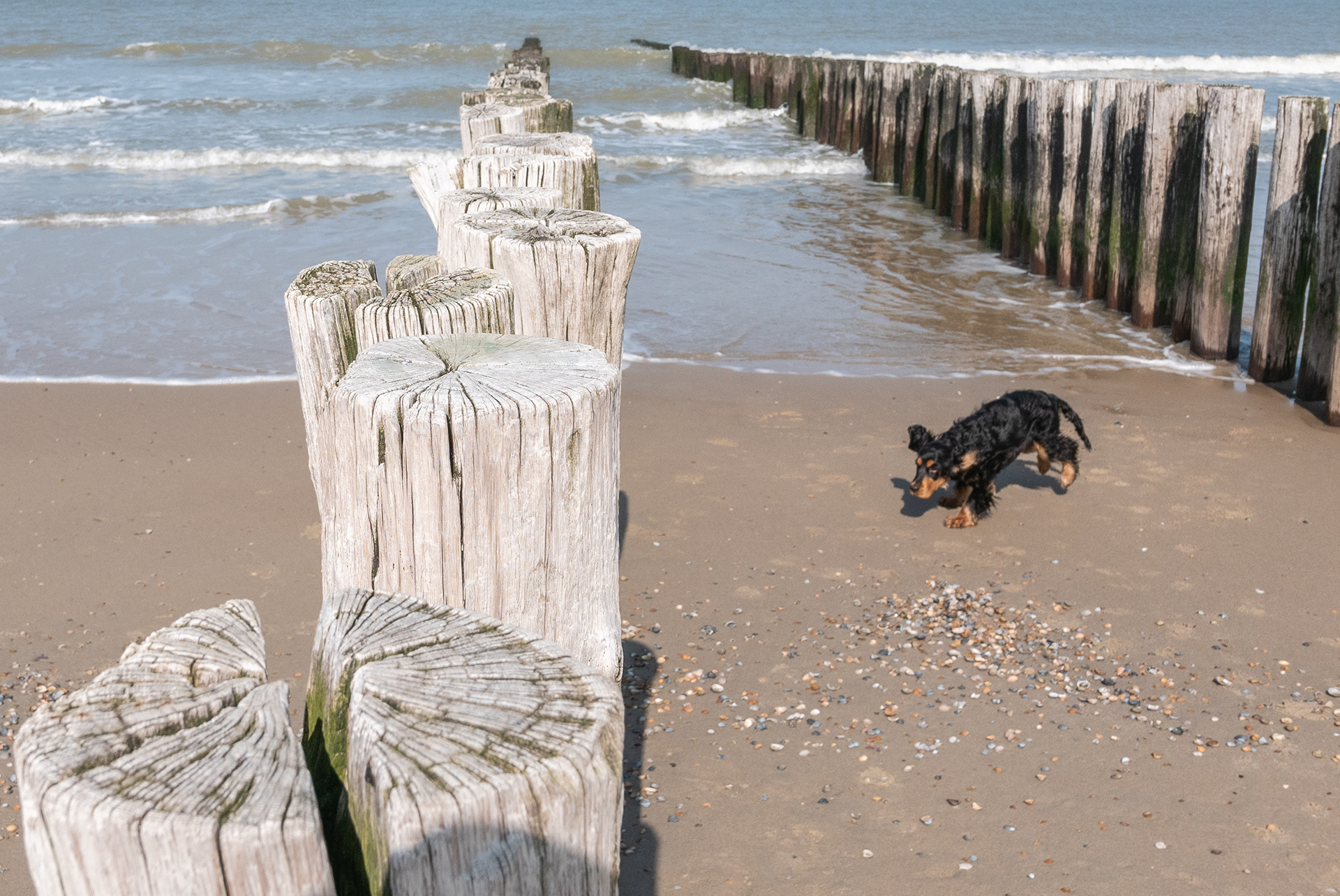 23-3-2021 - Twee primeurs in een foto. Brodie is voor het eerst op het strand en mag los lopen, wat natuurlijk rennen wordt. Het lukt de fotograaf om hem voor het eerst op volle snelheid te fotograferen. Allebei in onze sas dus.