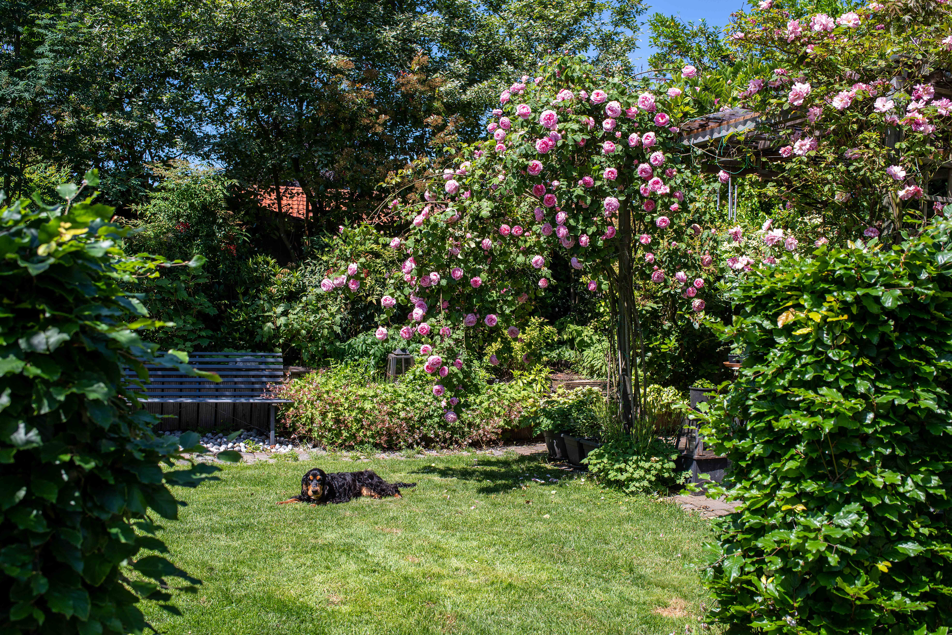 7-6-2021- Brodie op zijn favoriete plekje in de tuin, lekker in het zonnetje ligt hij op het gazon, onder de rozen. Een lieflijk tafereel. Een half uur later is hij bezig er een kuil te graven om een kauw-bot te begraven.