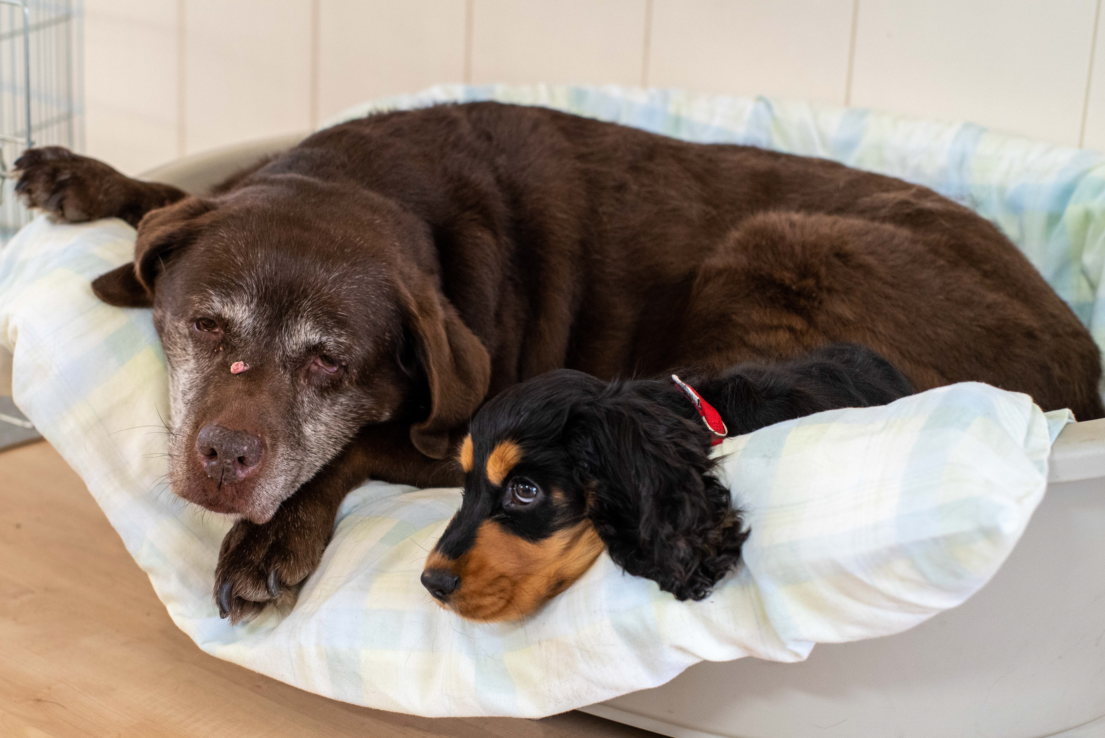 24-12-2020 - De oude dame Dribbel is op bezoek, Brodie vindt het geweldig om bij haar in de mand te liggen. Dribbel gedoogt.