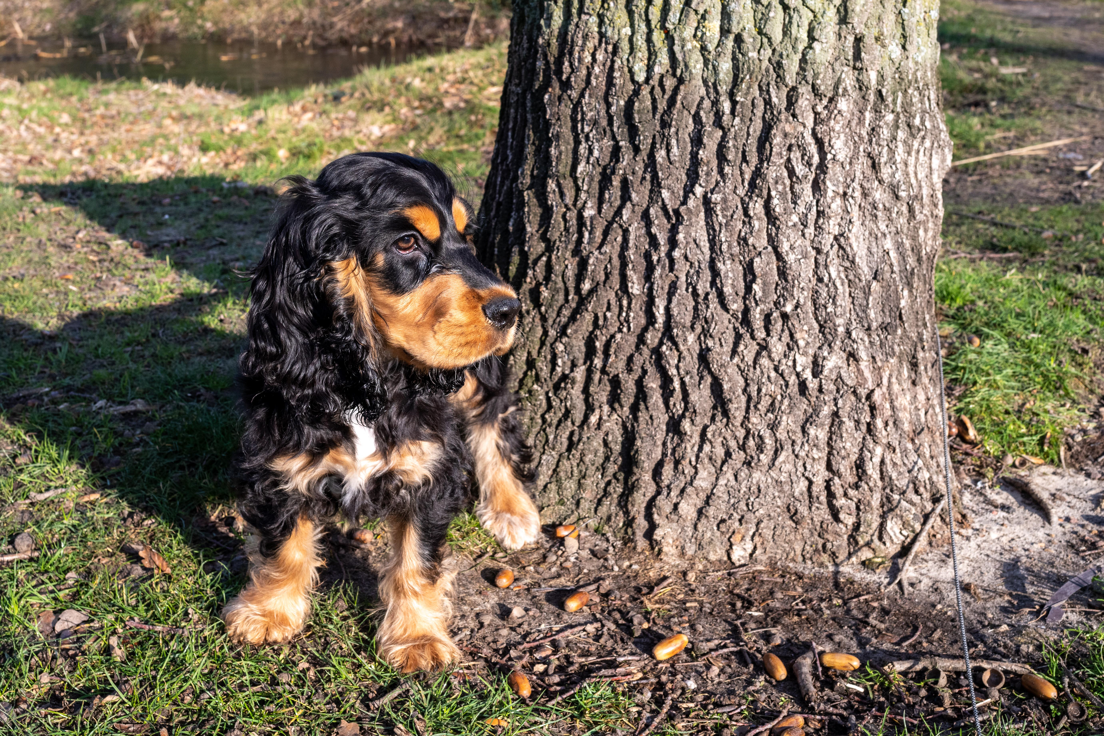 31-11-2021 - Wandelen aan de lange lijn is nog een hele kunst, de fotograaf gaat links van de boom en Brodie rechts, de status quo die vervolgens ontstaat, bevalt Brodie wel.