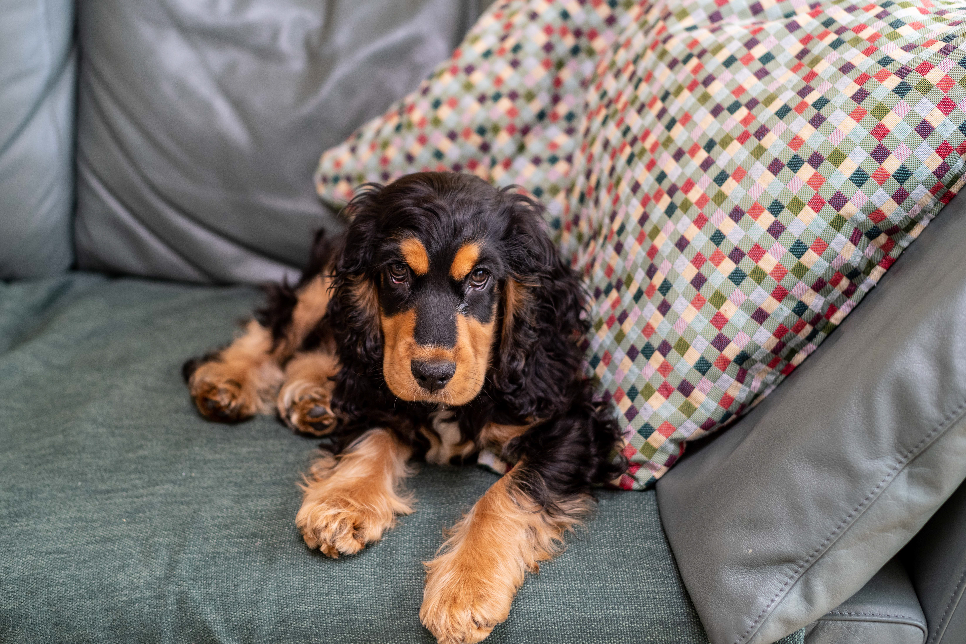 29-9-2021 Brodie op een zwartleren-bank; dat vraagt om een zwart-wit foto.
