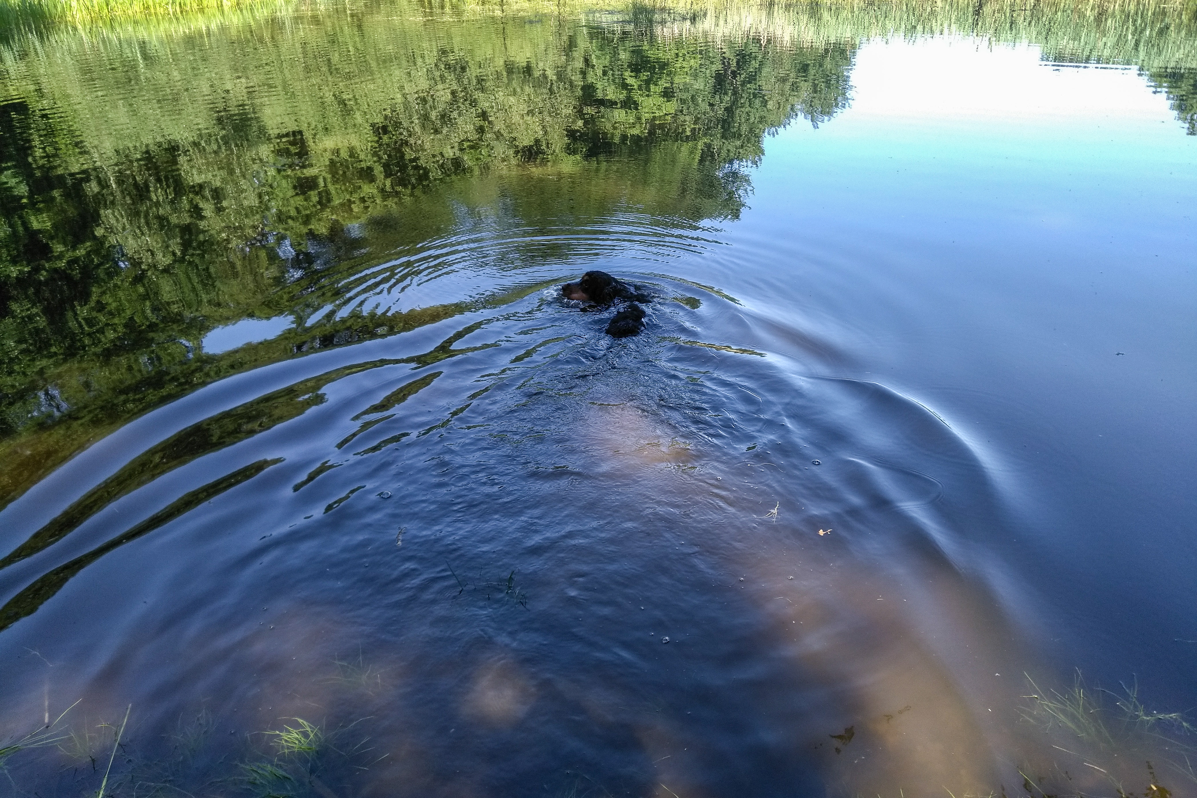 10-6-2021 - Brodie houdt van water, hij loopt graag door sloten. Vandaag niet in de sloot, maar in een vennetje, en dat betekent echt zwemmen.