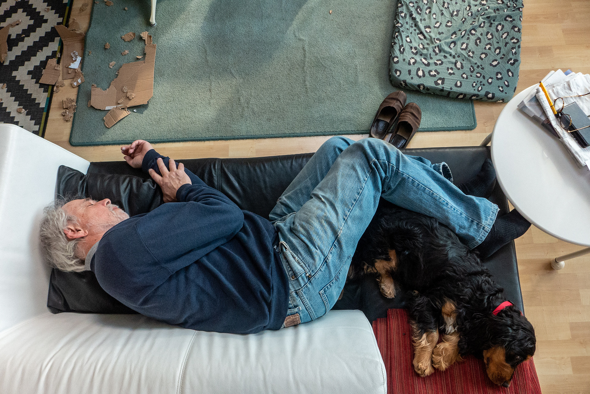 7-3-2021 - 16.30u. Met z'n drieën op de bank; de fotograaf, mijnheer Parkinson en Brodie. (foto Hanne de Jong)