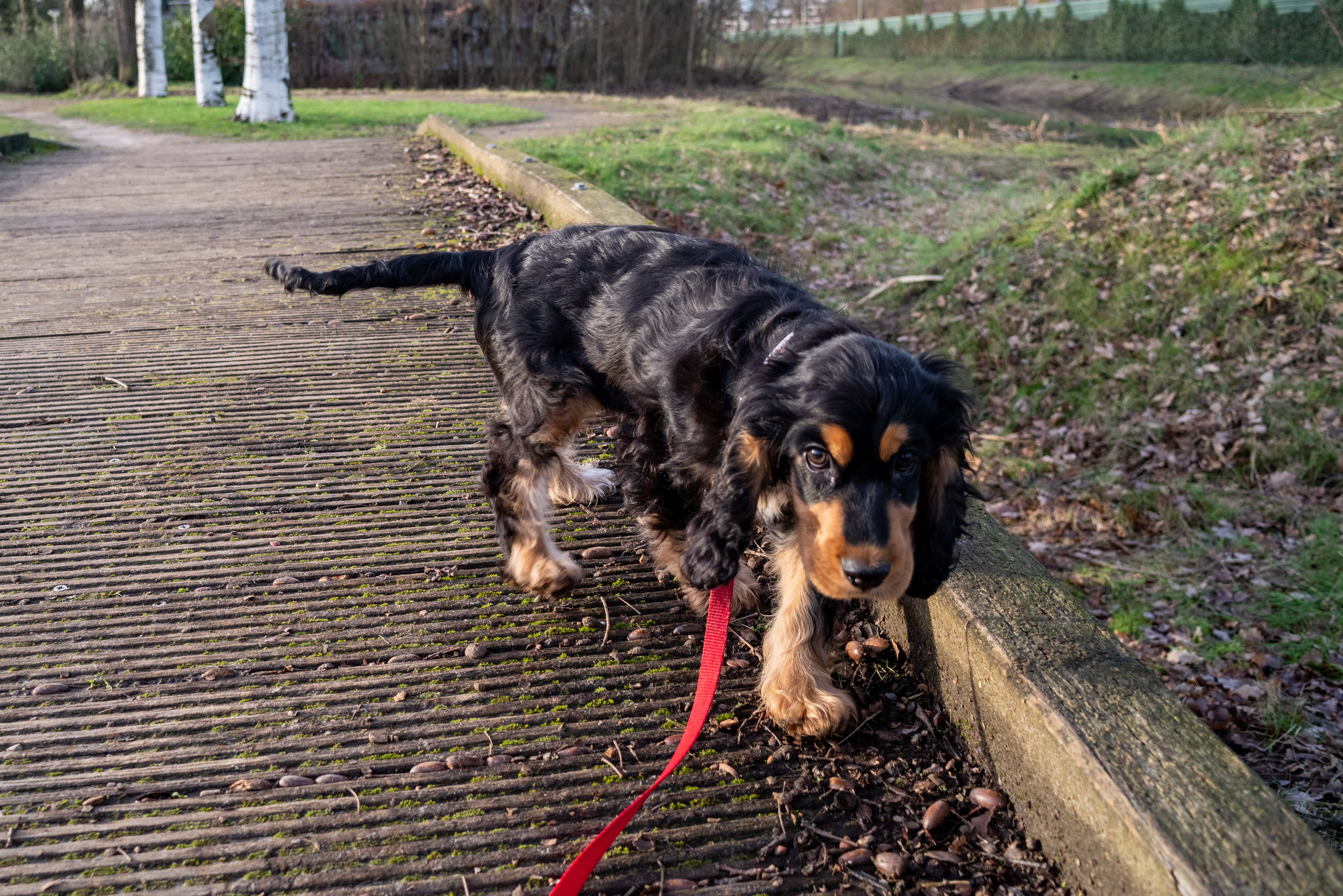 22-1-2021- 'n Dun waterig zonnetje lokt de fotograaf en Brodie naar buiten voor een blokje om. Lange wandelingen maken kan nog niet met een pup (stelregel: evenveel minuten wandelen als de pups leeftijd in weken). Voor Brodie betekent dat ongeveer 'n kwartier, waarvan hij zeker de helft met zijn neus over de grond speurt. De andere helft van het kwartier is hij fotogenieker, met dank aan het dunne waterige zonnetje.